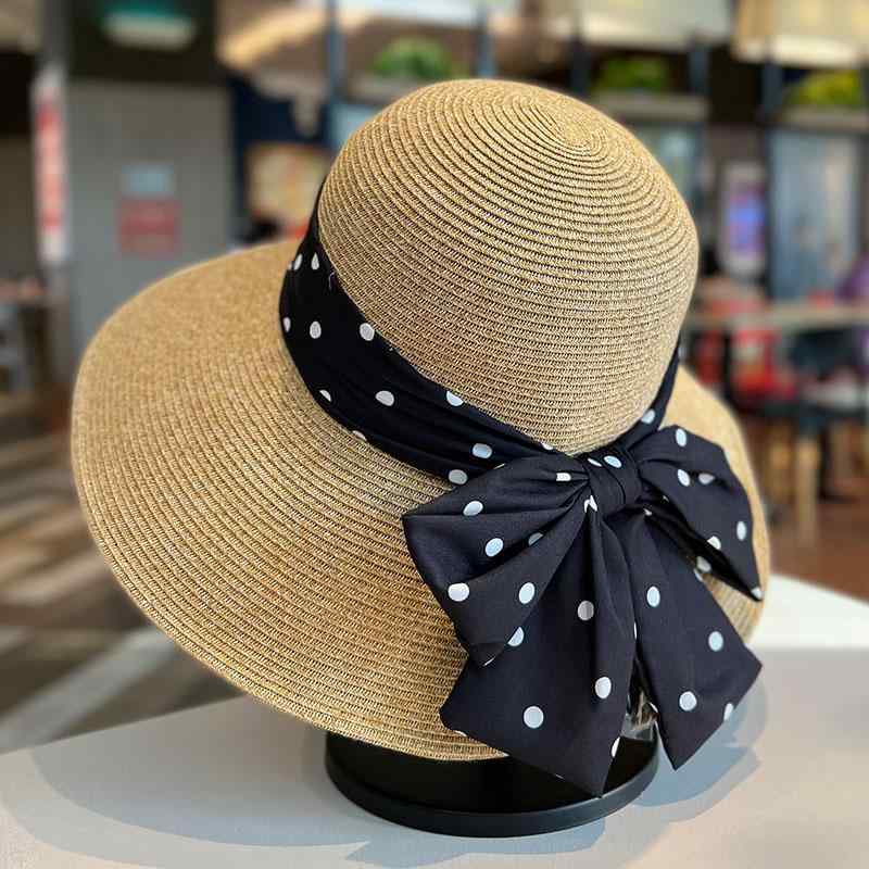 つば広 日焼け防止 麦わら帽子 レディース 水玉模様 リ…