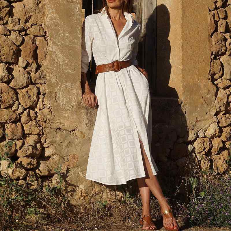 シャツワンピース ミモレ丈 Aライン フレア 長袖 襟付…