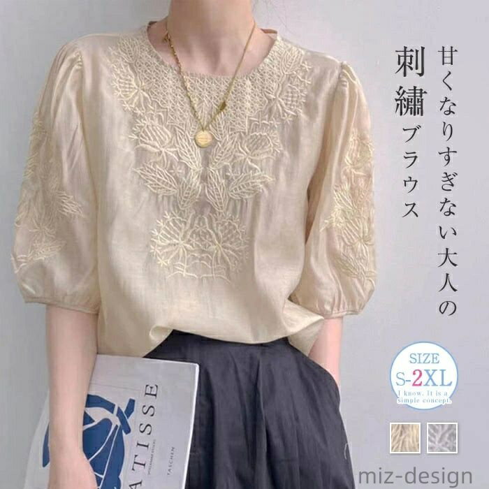 ブラウス レディース 五分袖 シャツ 花柄 刺繍 夏 襟…