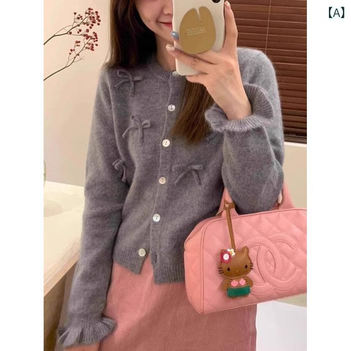 ニットカーディガン レディース ラウンドネック リボン …