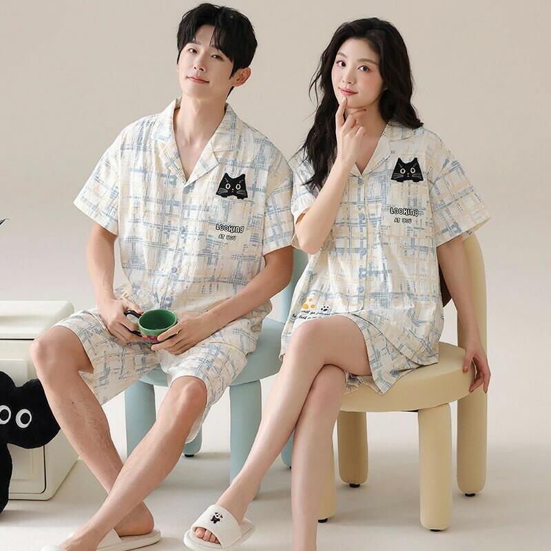 ペア パジャマ 半袖 夏 男女2着 セット 春 猫 前開…